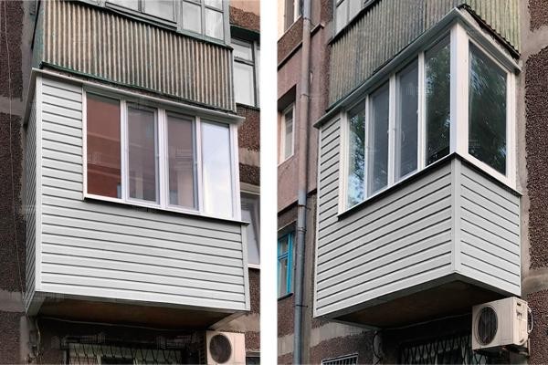 Отделка балкона со стороны улицы: профлист, виниловый сайдинг, металосайдинг. Крепим на прочный сварной каркас. Водоотлив в подарок!