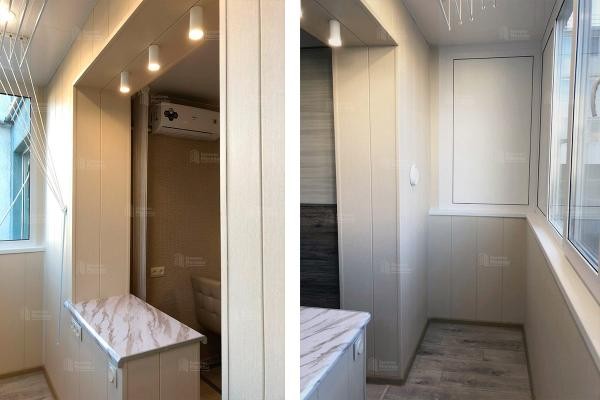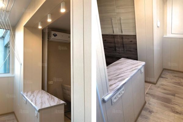 - Монтаж и отделка. Последовательно выполняем все работы: остекление → утепление → теплый пол → черновой пол → электрика и свет → чистовая отделка → откосы → установка шкафа и аксессуаров.