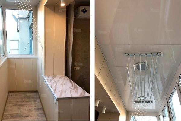 - Детали, завершающие картину. Установили столешницу из ПВХ на подоконный блок, потолочную сушилку для белья «Лиана», проложили стильный плинтус по периметру, маскирующий стыки. Установили москитные сетки на стальных крючках и минималистичный ПВХ-подоконник — для цветов или чашки кофе.